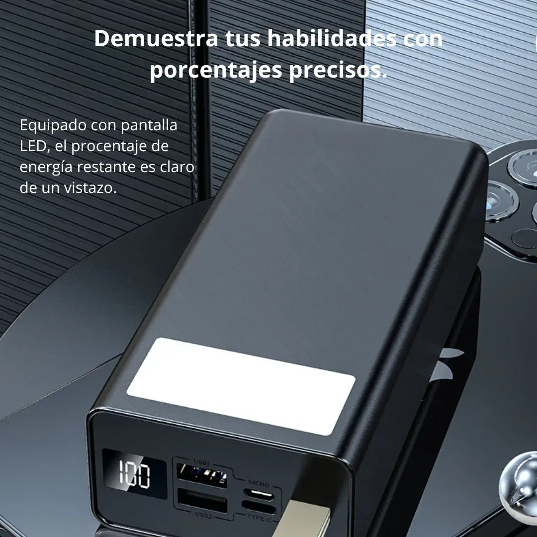 El Power Bank de 50000mAh con carga rápida de 50W es perfecto para quienes necesitan una fuente de energía confiable y duradera. Ya sea en casa, en viajes largos o al aire libre, este cargador portátil te ofrece múltiples cargas y funciones adicionales.