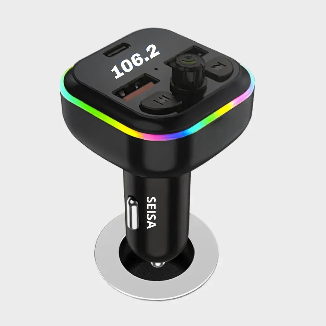 Controla tu música y carga tu celular al mismo tiempo con este transmisor FM Bluetooth con luces LED, cargadores rápidos PD/QC y llamadas manos libres.